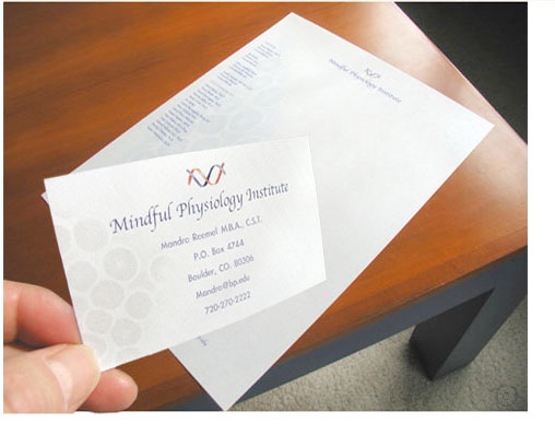 Mindful Physiology Institute teaches physiological monitoring of blood gas and cellular chemistry to health care professionals. The business card is evocative of cells and the DNA double helix as the brand definition. In 2010 the institute revised its name to more specifically address instructional objectives. With the name change a revision of the logo was created. The image link to the right displays the new logo design.